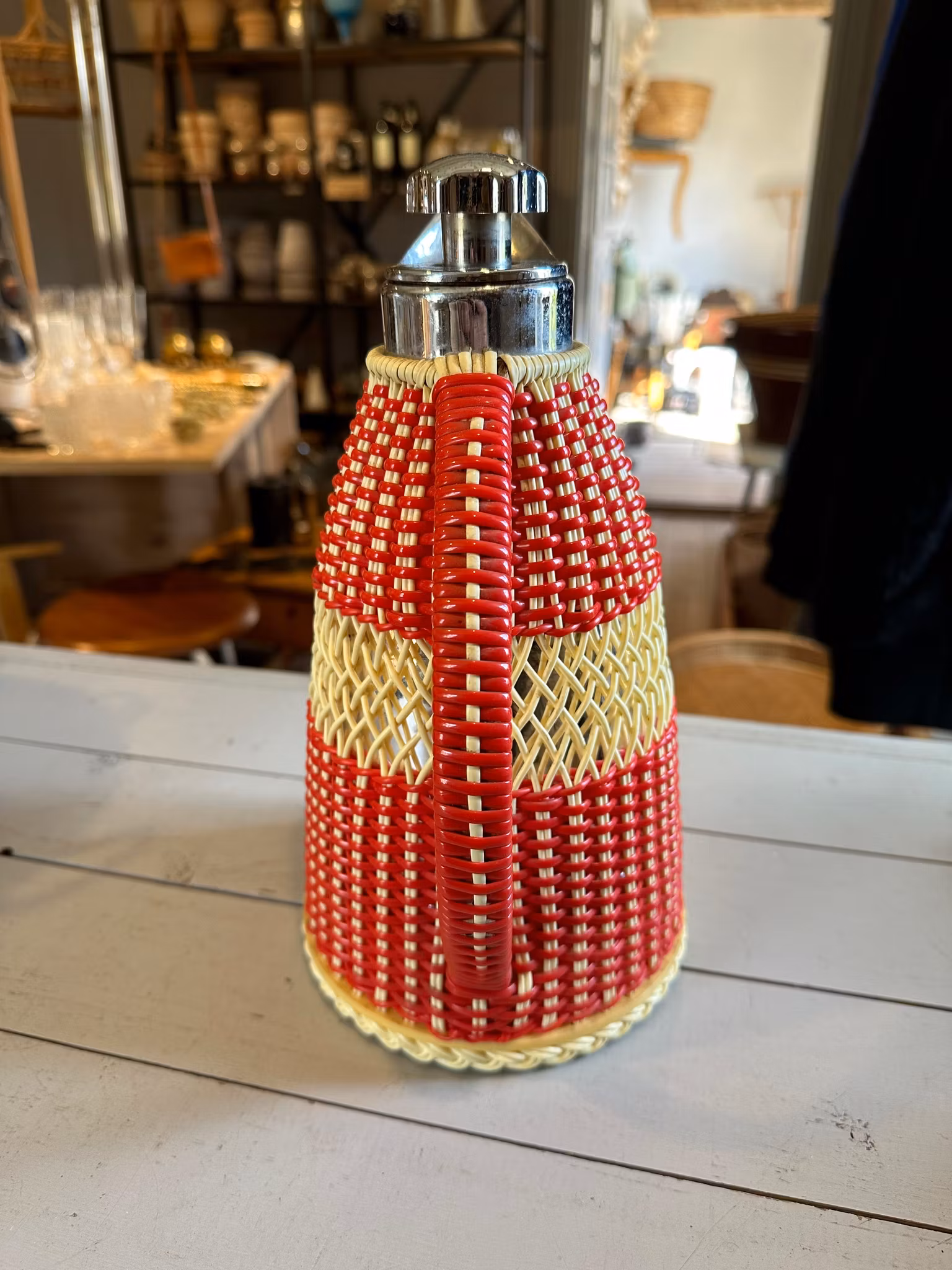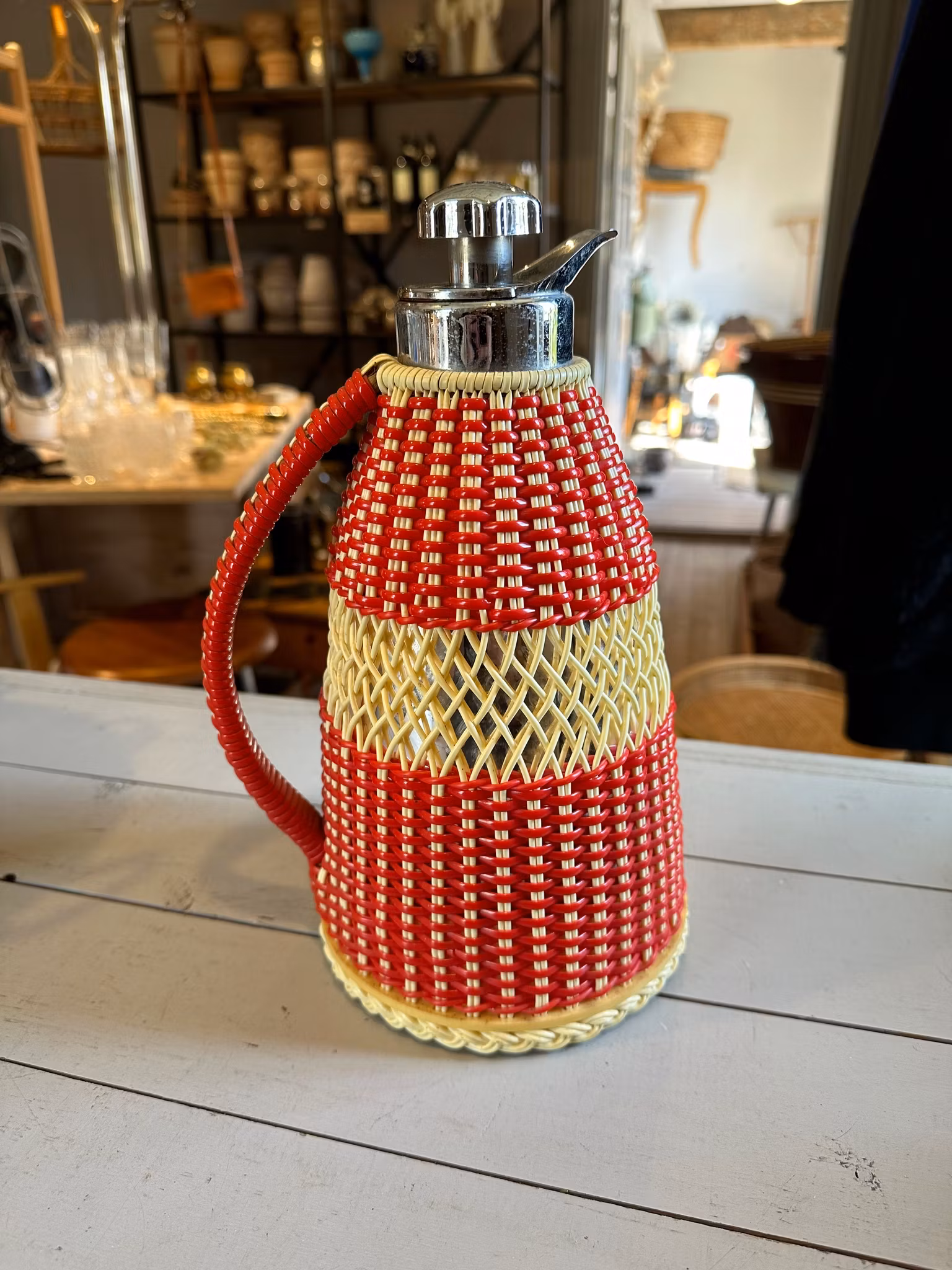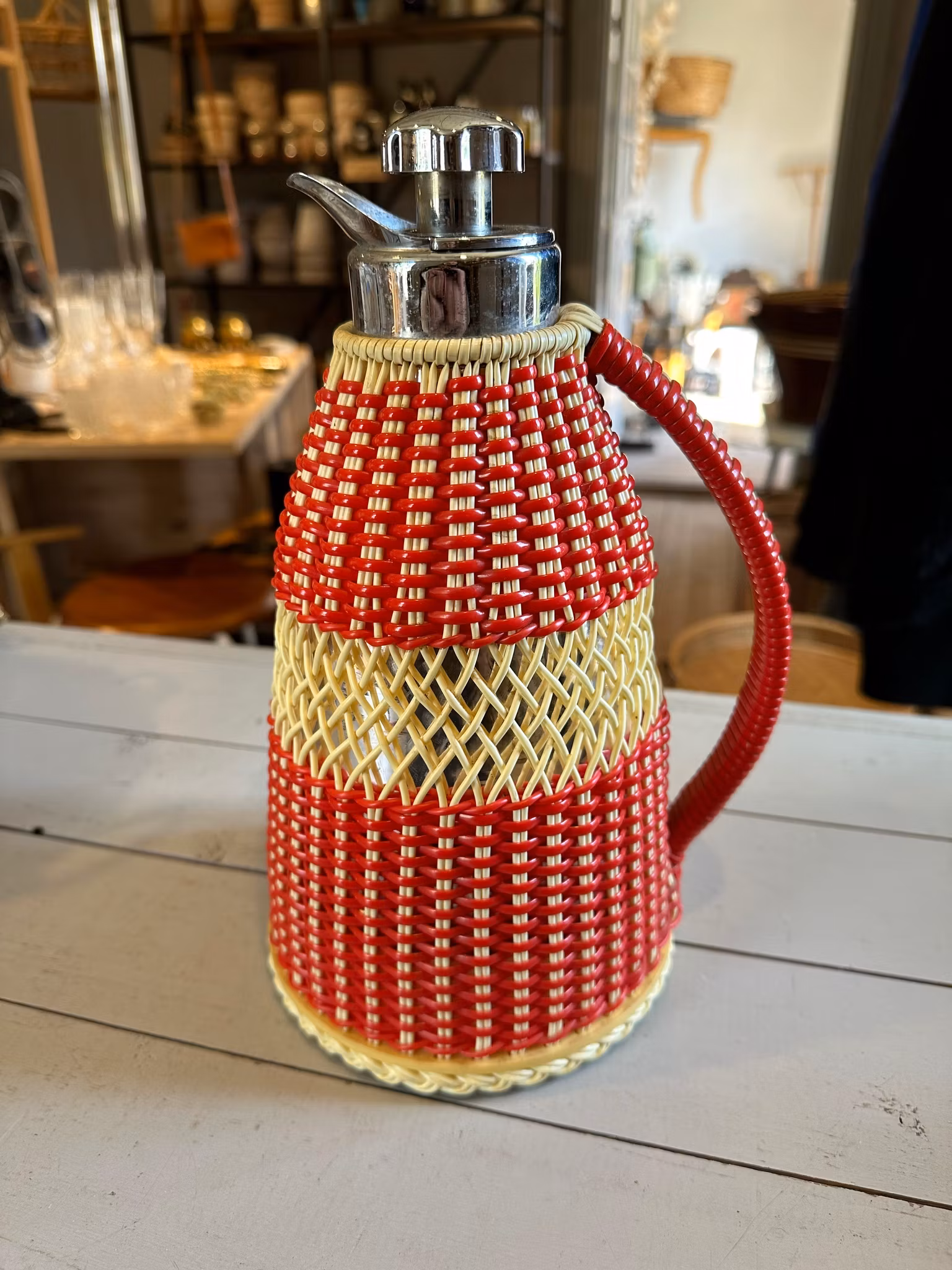 Charmig gammal tevekanna eller kaffekanna i rött och ljustgult gjord av AB Termoverken Jönköping. Dekorativ inredningsdetalj och en stilren klassiker.