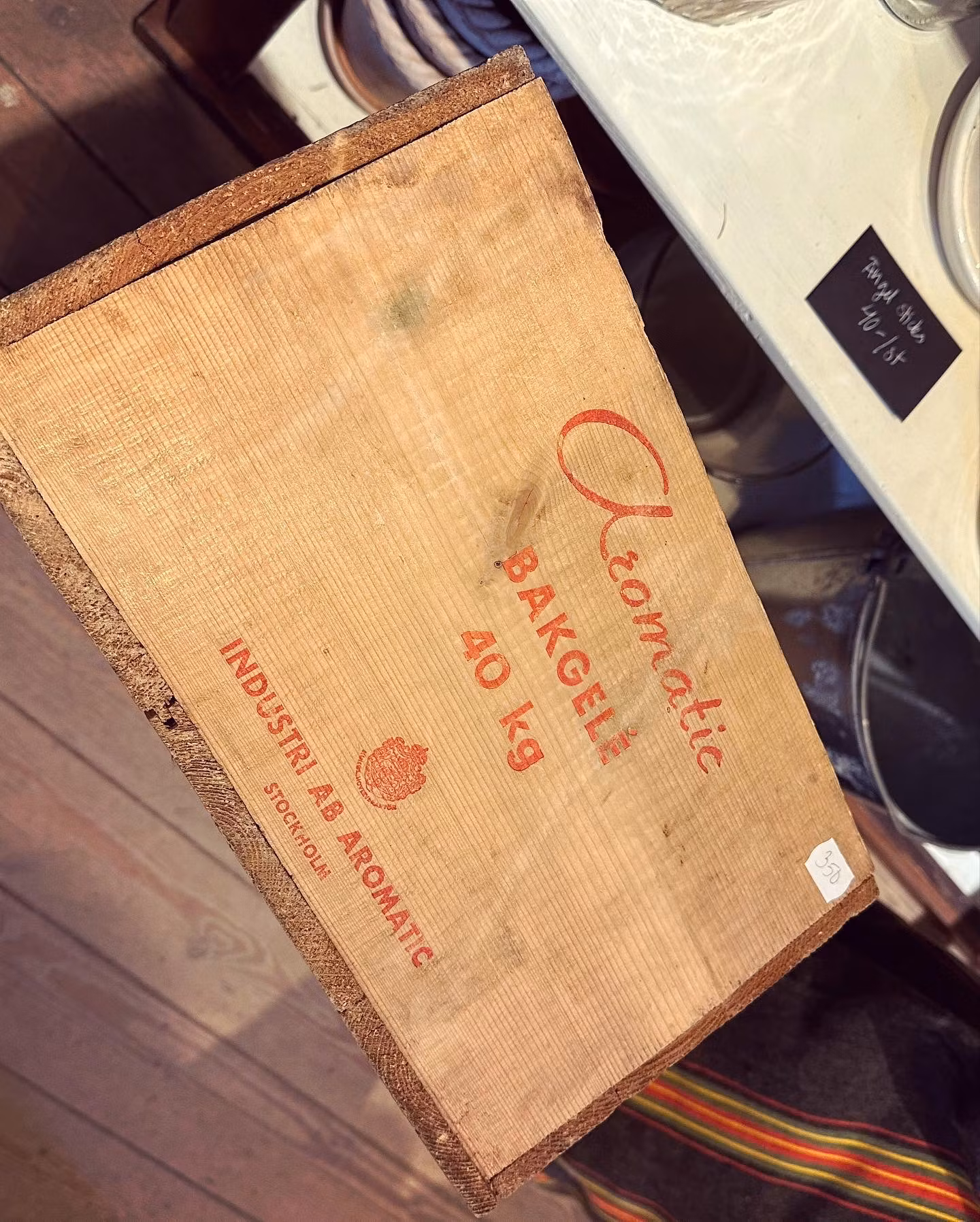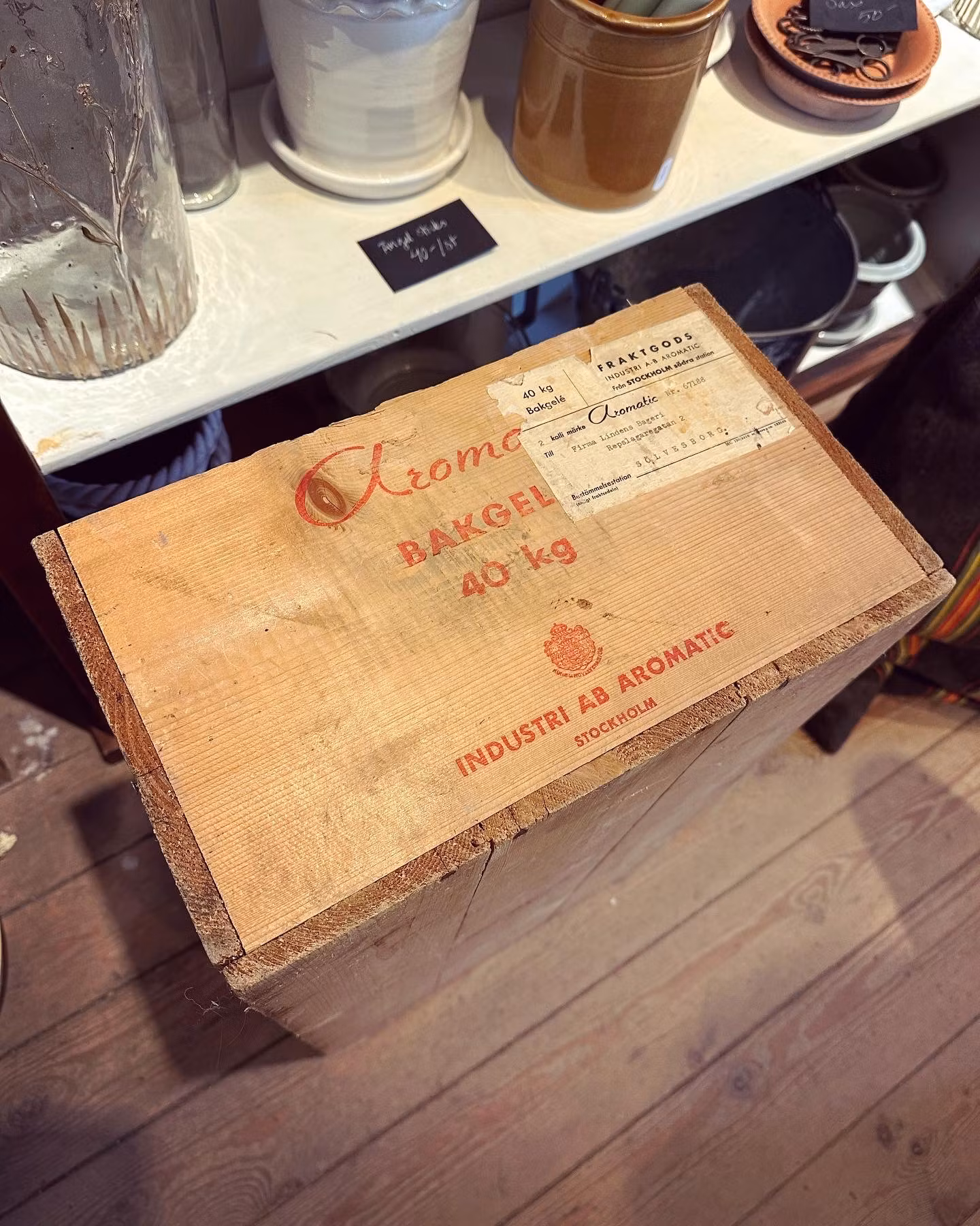 Charmig gammal trälåda som innehållit Aromatic Bakgelé. Text finns på utsidan på kortsidorna och adressetikett för frakt till ett bageri i Sölvesborg. Perfekt till lite ved eller annan förvaring.