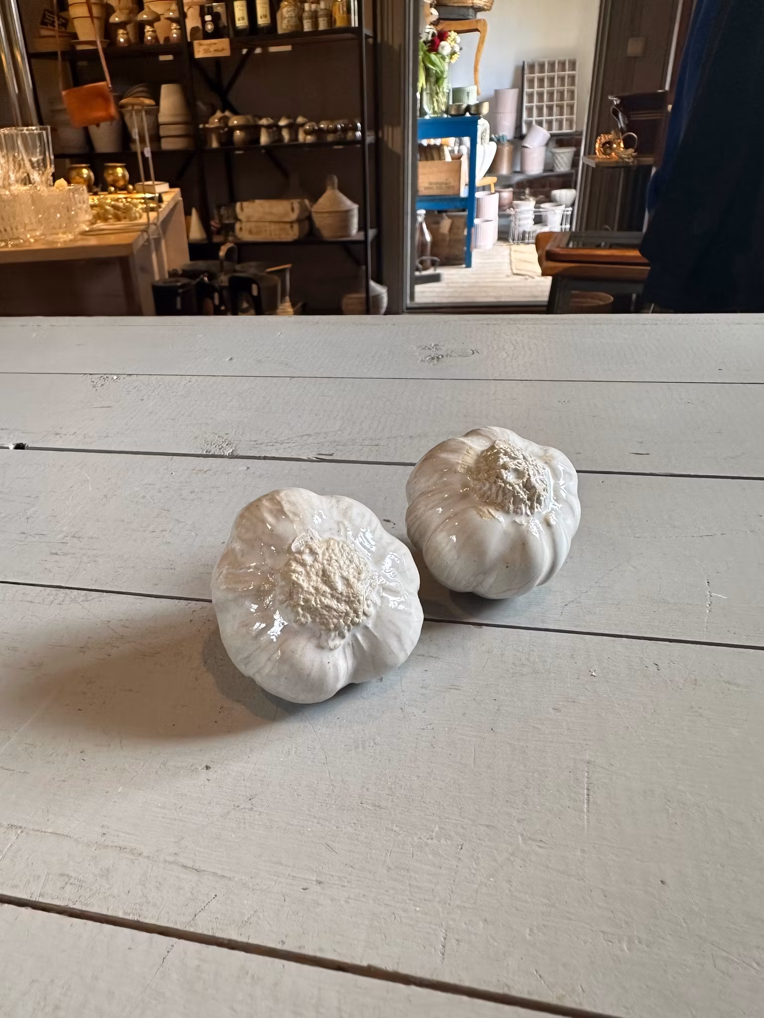 Fina små vitlökar i keramik med vit glasyr. Säljes i par.