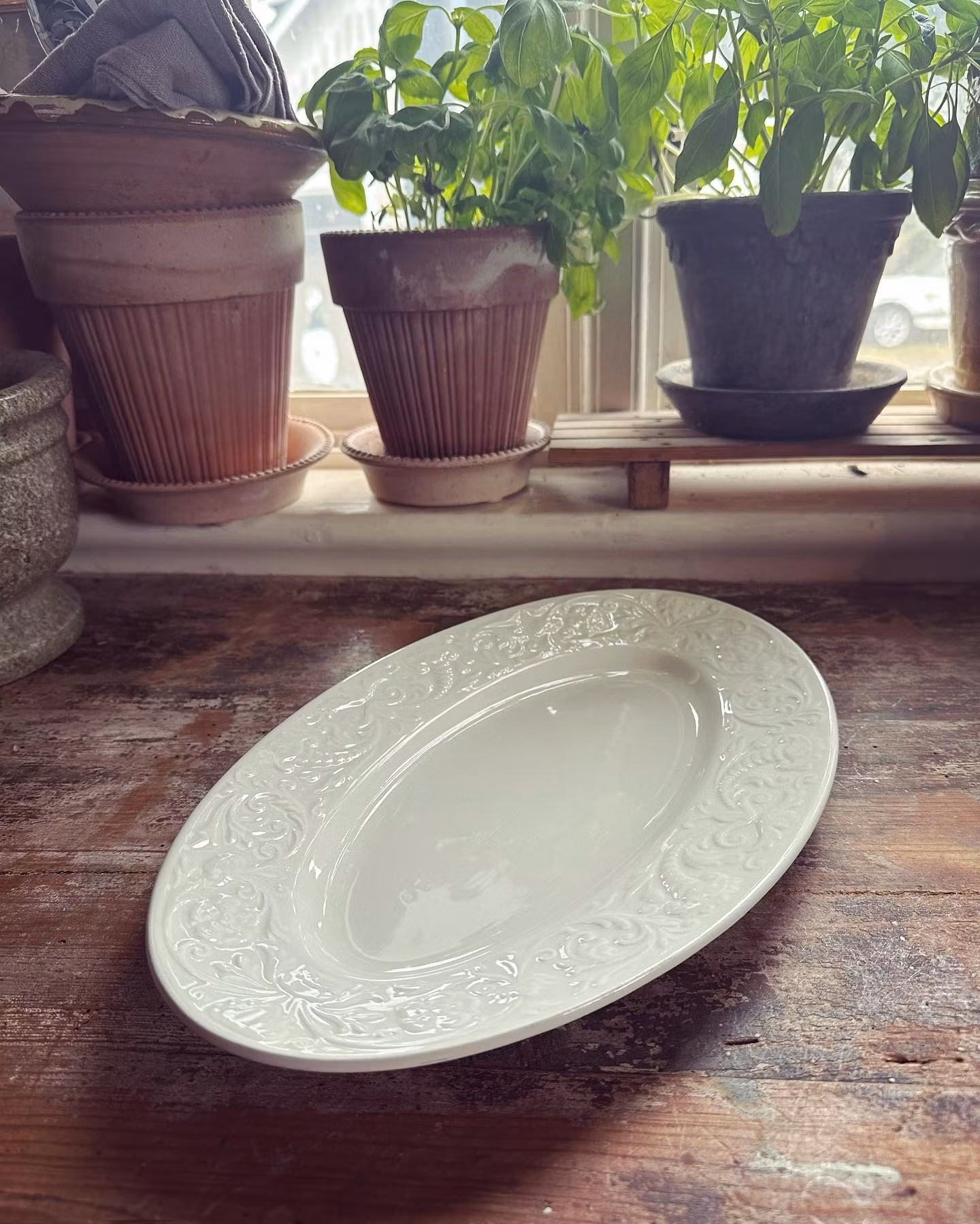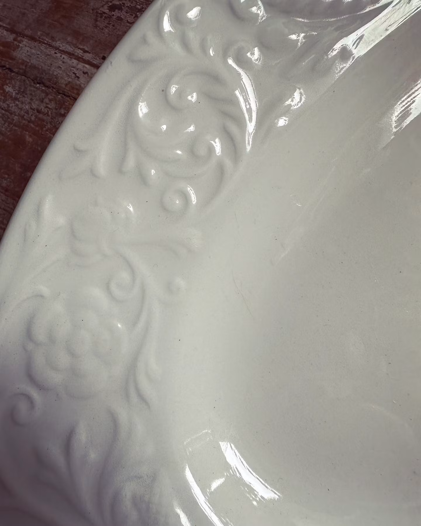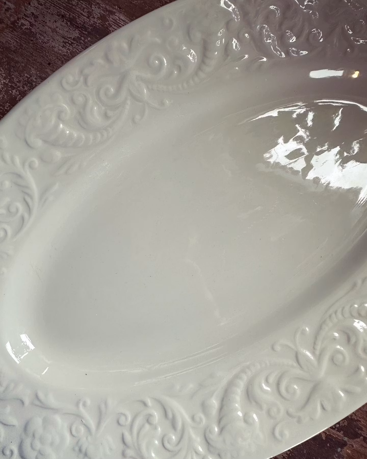 Vitt italienskt uppläggningsfat med dekor på kanten.